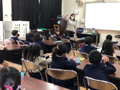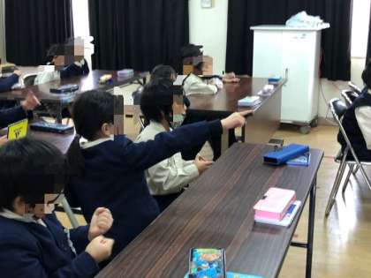 1年生の英語です。クリスマスの絵を指さしながら先生が英語でお話をしていました。とても楽しそうでした。