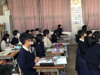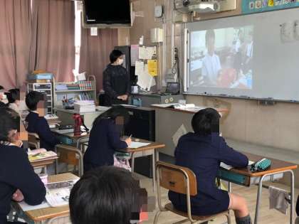 4年生の図工です。木版画の作成に際して、版画版を彫っていくときの彫り方や注意等を解説したビデオを観ました。危険な作業なので十分注意して進めます。