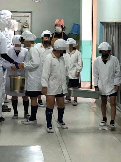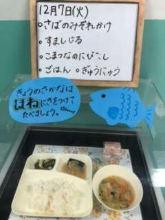 今日の献立は、サバのみぞれかけ、すまし汁、小松菜の煮びたし、ご飯、牛乳です。小骨に気を付けていただきましょう。