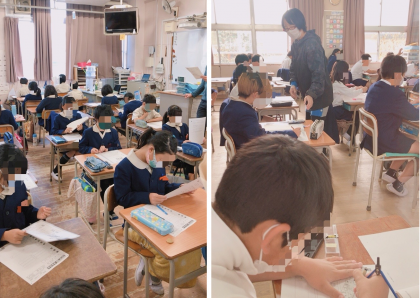 経年調査2日目です。3年生と4年生(写真上2枚)は2教科、5年生と6年生(写真下2枚)は3教科あります。子どもの学習理解度や学習状況を知り、目標をもって主体的に学習に取り組むとともに、きめ細かな指導につなげます。