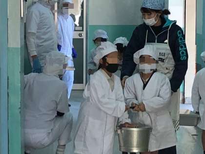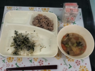 今日の献立は、じゃこ菜っ葉ごはん、豚肉のスタミナ焼き、あつあげと冬野菜のあったか煮、牛乳です。いただきます。