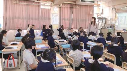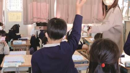 2年生の算数です。九九の学習です。列ごとに立って、先生が質問した式の答えを素早く答えます。九九のどの段でも反射的に答えが出てくるよう習熟させていきます。