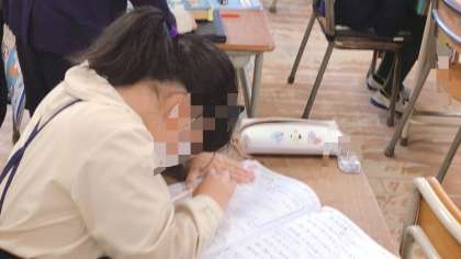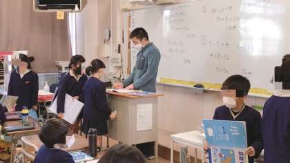 3年生の算数です。算数ドリルに取り組んでいました。できたところは先生に〇付けをしてもらっています。