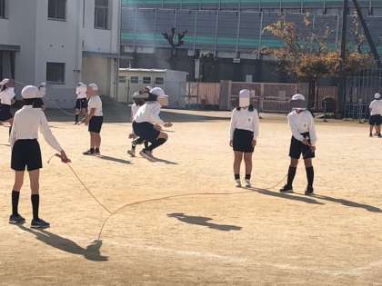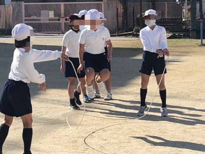 4年生の体育です。なわ跳びの学習で、短なわの練習をした後長なわの練習をしました。なわが回るリズムに合わせてどんどん連続で跳んでいきます。何人連続で跳べたかな。