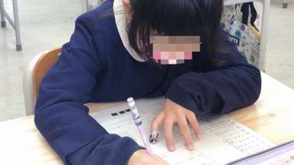 2年生の算数です。テストをしていました。できたところが間違っていないか見直しもしっかりします。
