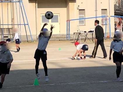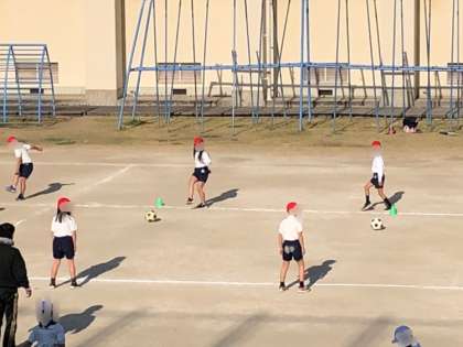 2年生の体育です。サッカーボールを使ってスローイングやキックでのパスなどをしました。相手にうまくパスできるよう頑張っていました。