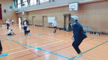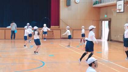 5年生の体育で、なわとびの学習です。短なわのいろいろな技に挑戦していました。