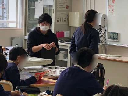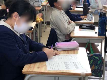 5年生の音楽です。プリントによるテストをしながら歌唱のテストもしていました。歌唱のテストは皆とても緊張している様子でした。