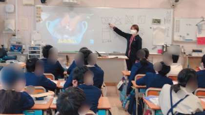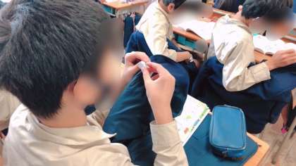 6年生の家庭科です。洗濯の学習です。衣類の洗濯表示にどんなものがあるか、実際に自分の標準服やセーターなどについているタグを調べていました。