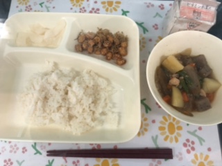 今日の献立は、鶏肉と野菜の煮物、じゃこ豆、かぶのゆず風味、ご飯、牛乳です。おいしくいただきました、ごちそうさまでした。