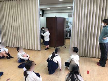 来週からの「かけ足週間」に備えて全児童の検診を行いました。名前が呼ばれて衝立の向こうで診てもらうまで静かに待っています。
