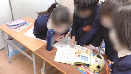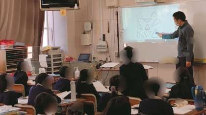 3年生の算数です。図形の学習で、いろいろな三角形を特徴によって仲間分けをしていました。班で話し合って分けていました。辺の長さに着目した班が多かったようです。