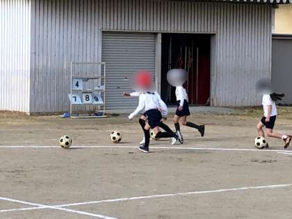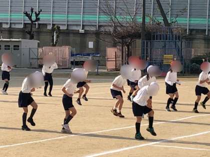 2年生の体育です。ボール遊びの学習です。サッカーのようにドリブルでトラックを1周するのに挑戦していました。寒いので準備運動をしっかりして臨みます。