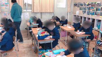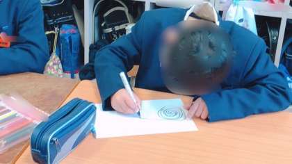 3年生の図工です。「ぐるぐる線」の学習をしていました。ひと筆書きのように線を長くゆっくり途切れないように描いていきます。すごく集中していました。