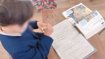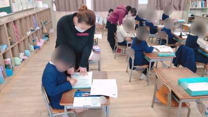 1年生の国語です。お話を作る学習です。どんなお話にするか主人公の特徴や出来事などを考えてメモしていました。