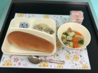 今日の献立は、アジのレモンマリネ、てぼ豆のスープ煮、固形チーズ、黒糖パン、牛乳です。いただきます。
