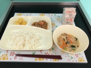 今日の献立は、鶏肉の甘辛焼き、かす汁、栗きんとん、ごはん、牛乳です。いただきます。