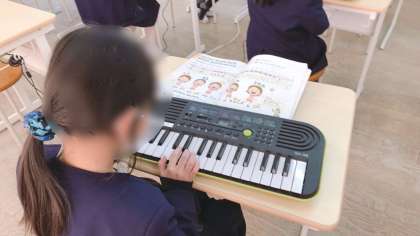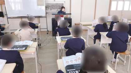 1年の音楽です。今日もミニオルガンを使っての学習でした。先生のオルガン奏に合わせてリズム奏をしていました。