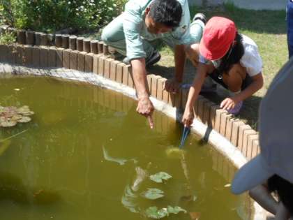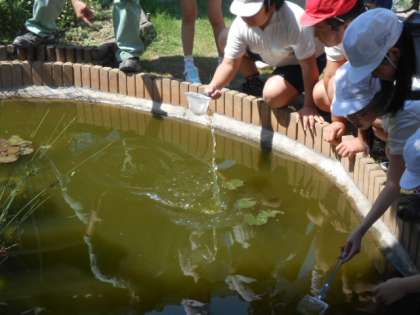 5年生の理科で観察するためのメダカをビオトープで捕まえています。