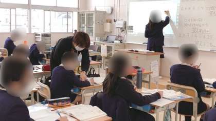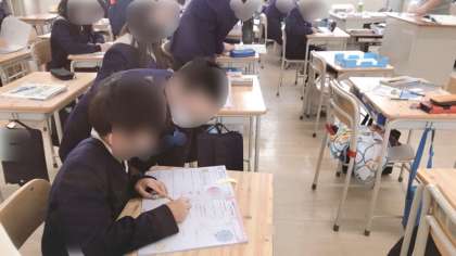 下段が2組。算数ドリルに取り組んでいました。わからないところは互いに教えあって進めていました。