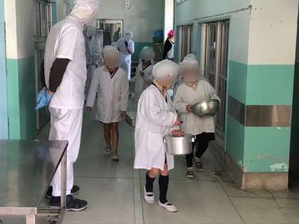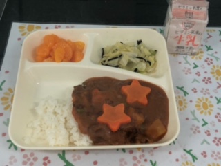 今日の献立は、ハヤシライス、キャベツのひじきドレッシング、みかん(缶)、牛乳です。いただきます。