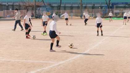 5年生の体育です。ランニング等しっかり準備運動をした後、サッカーの学習に入りました。