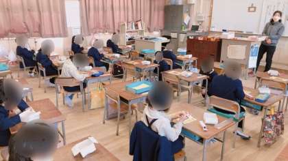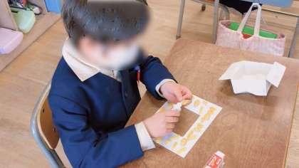 1年1組の図工です。パスタを使ってきれいな額縁づくりをしていました。