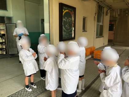 今日の献立は、赤魚のレモン醤油かけ、うすくず汁、高野豆腐のいり煮、ごはん、牛乳です。手を合わせて、いただきます。