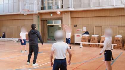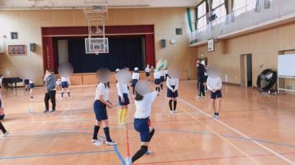 6年生の体育です。バレーボールの学習です。パスがどれだけ続くか学級で目標数を決めて、各グループで続いた数を合計して目標数と比べていました。