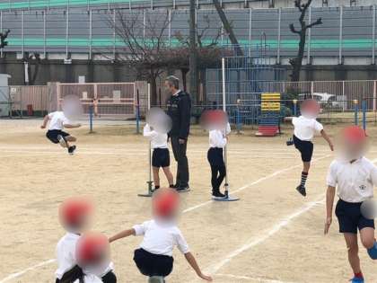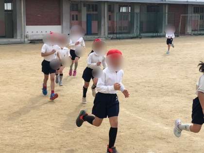 1年生の合同体育です。持久走やゴム跳びなど、走や跳の運動あそびでしっかり体を動かしました。