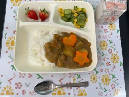今日の献立は、チキンレバーカレーラース、キュウリとコーンのサラダ、いちご、牛乳でした。おいしくいただきました。