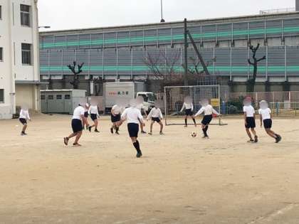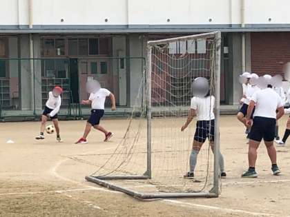 6年生の体育です。サッカーのゲームを楽しんでいました。