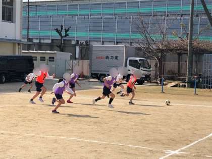 5年生の体育です。サッカーのゲームをしていました。みんなとてもしっかり動いていて迫力がありました。