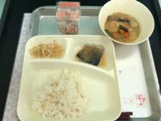 今日の献立は、さごしのおろし醤油かけ、一口がんもと里芋の味噌煮、もやしの柚子の香和え、ご飯、牛乳です。いただきます。