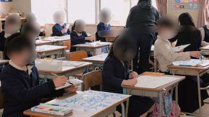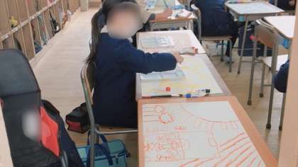 4年生の様子です。図工の学習でパスでしっかり線を描いた後、絵の具で丁寧に色塗りをします。