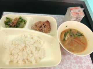 今日の献立は、豚肉の生姜焼き、さつまいもの味噌汁、菜の花のおひたし、ご飯、牛乳でした。ご馳走様でした。