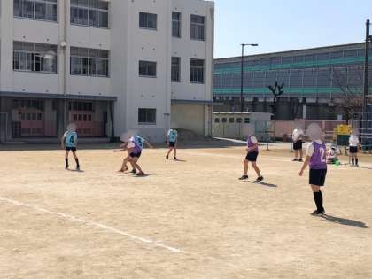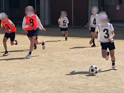 5年生の体育です。サッカーが白熱しています。どのチームも一所懸命です。