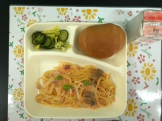 今日の献立は、鮭のクリームスパゲッティ、キャベツとキュウリのサラダ、黒糖ロールパン、牛乳でした。ご馳走様でした。
