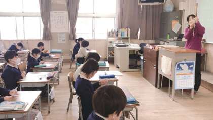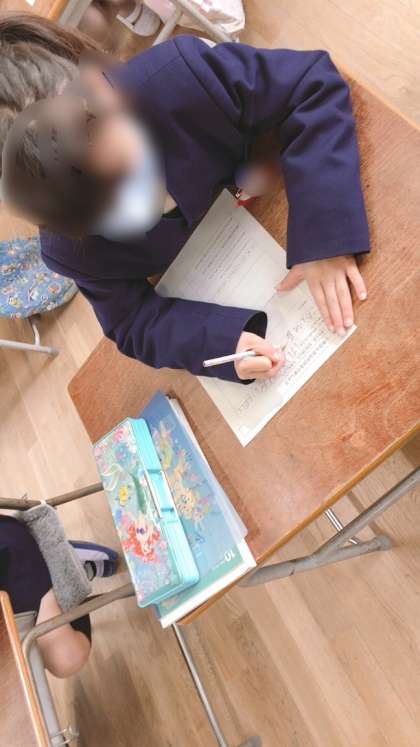 1年生の様子です。「一年間をふりかえりましょう」という題のプリントに自分が頑張ったことをまとめていました。