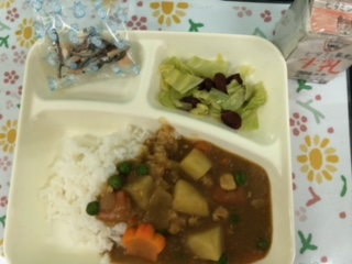 今日の献立は、チキンカレーライス、ビーンズサラダ、アーモンドフィッシュ、牛乳です。いただきます。