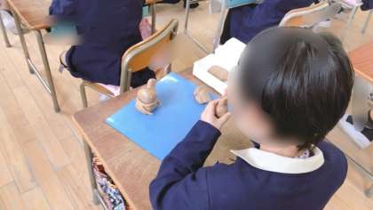 1年生の図工です。粘土で雪だるまやお弁当などを作っていました。この後、粘土板やヘラなどをきれいに洗って持って帰る用意をするそうです。
