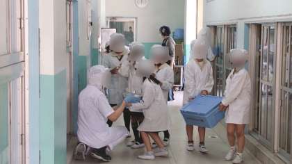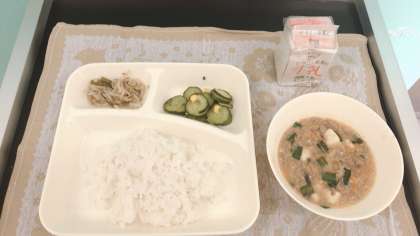 今日から給食です。今日の献立は、麻婆豆腐、キュウリとコーンの甘酢和え、もやしとピーマンのごま炒め、ご飯、牛乳です。