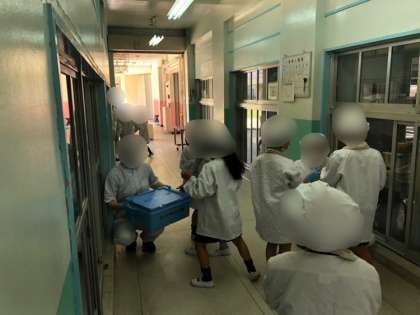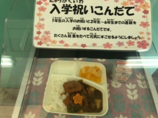 今日の献立は、カツカレーライス、フルーツゼリー、牛乳です。1年生の入学お祝い献立です。お祝いの思いがこもったカレーをいただきましょう♪