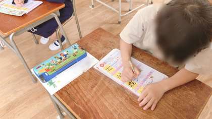 2年生の様子です。漢字の学習です。先生と一緒に書き順を確認した後、各自で練習します。