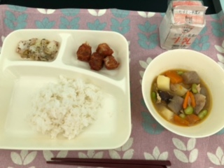 今日の献立は、マグロのオーロラ煮、豚肉と野菜の煮物、キャベツの赤紫蘇和え、ご飯、牛乳です。いただきます。