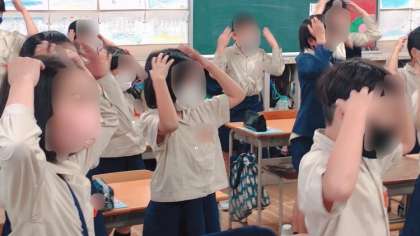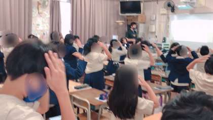 4年生の英語です。リズムに合わせて体を動かしながら、体の部位の単語を覚えていきます。
