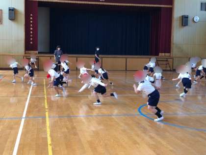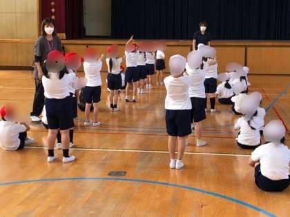 1年生の体育です。運動場が使えなかったので体育館でしました。