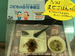 今日は、子どもの日献立ということで、きんぴらちらし、すまし汁、ちまき、牛乳です。いただきます!