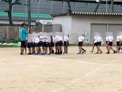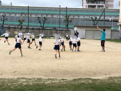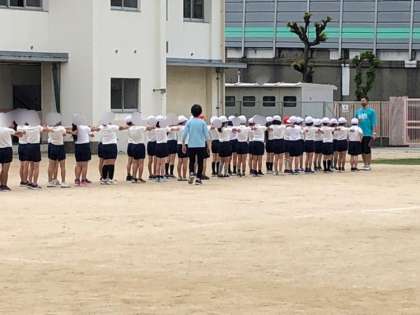 4年生の体育です。集団行動の練習です。先生のいる所に素早く集まり整列したり、並んで駆け足したりしていました。