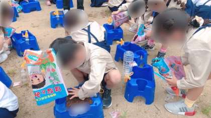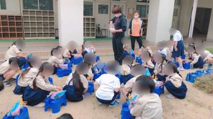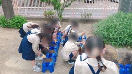1年生の生活科です。朝顔を育てます。植木鉢に土と肥料を入れ、種を蒔きました。元気に育ってくれるようたっぷり水をあげました。